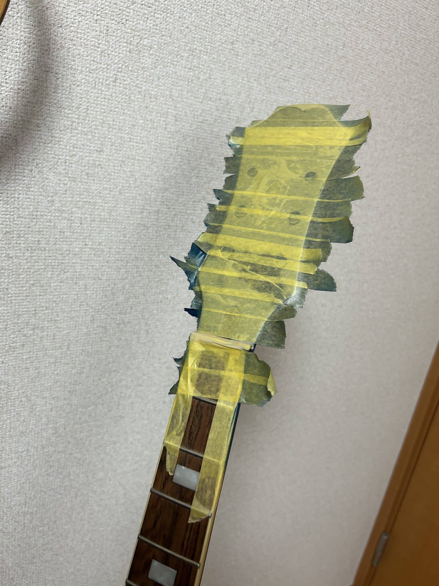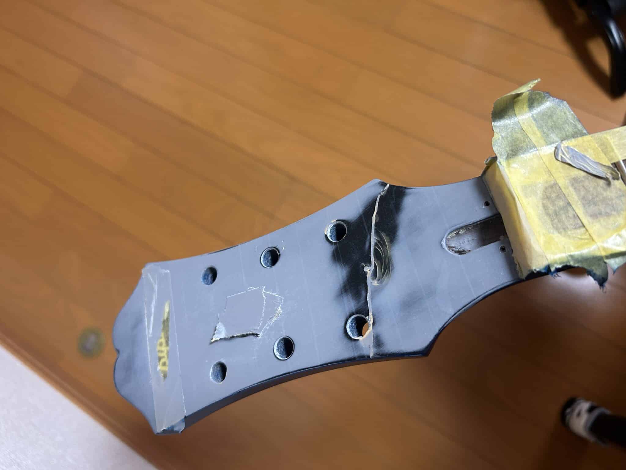 ヘッドの6弦ペグあたりから1弦ペグ下あたりまで斜めにバキっといったらしく、一度簡易的に接着されていた物で、ちょっと時間と手間がかかりそうであった。