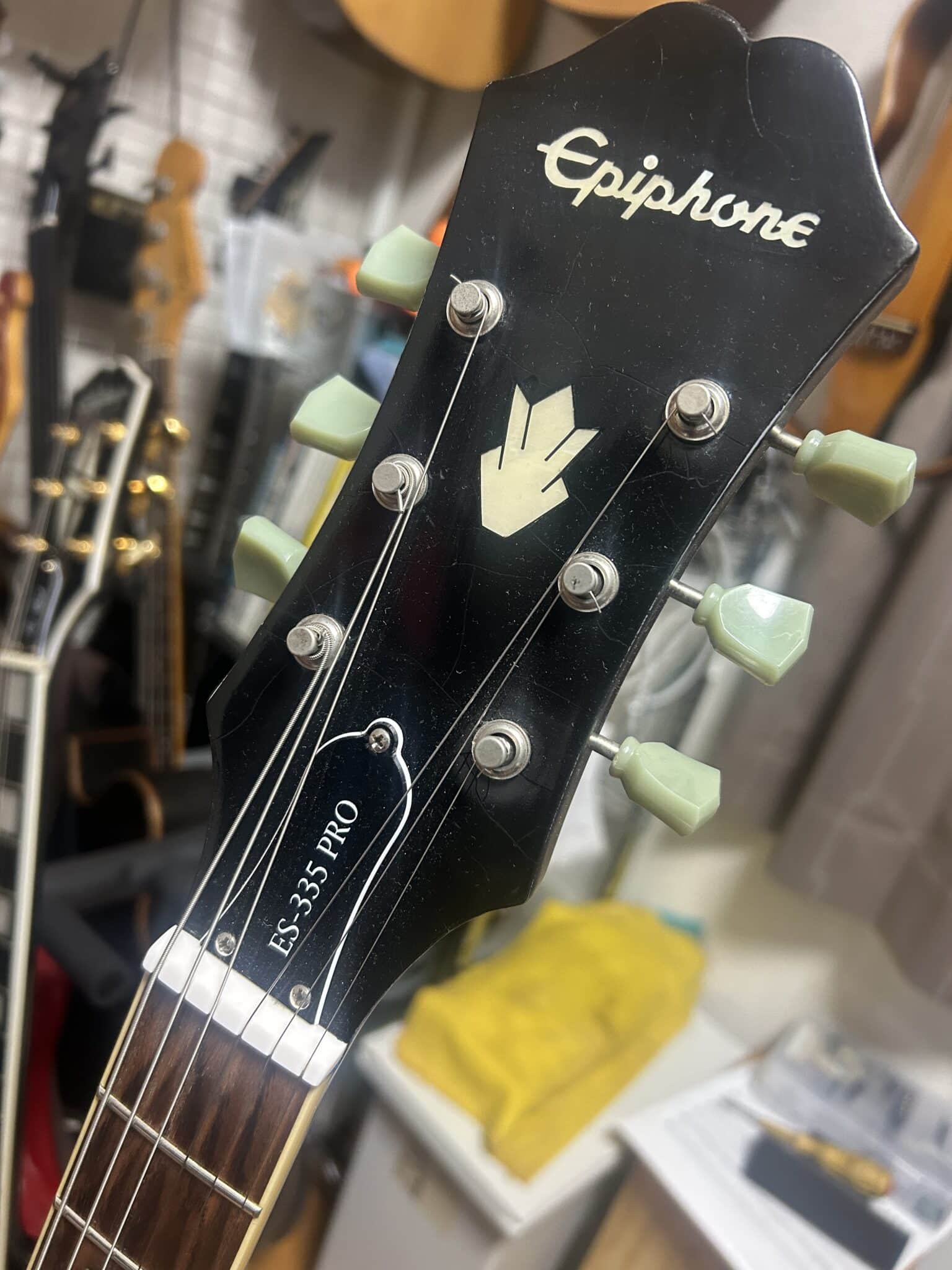 このES335って本家『Gibson』のモデルで、今までEpiphoneで作られた物は『DOT』ってモデル名で扱われていたのに最近このスペックになって(大して違わないんだが)ES335って名乗れるようになったらしい。ほかにもGibsonでやってんのがES330でEpiphoneで作ってんのが『カジノ』とかあったんだがね、紛らわしいです。まぁどっちでもいいけどね、イイ音すりゃね!なによりもコイツカラーがスッゲぇ気に入ってんですよ!あと、弾いてビックリ今まで無かった感じで凄く良い!結構万能にいろんなジャンルで使えそうね!