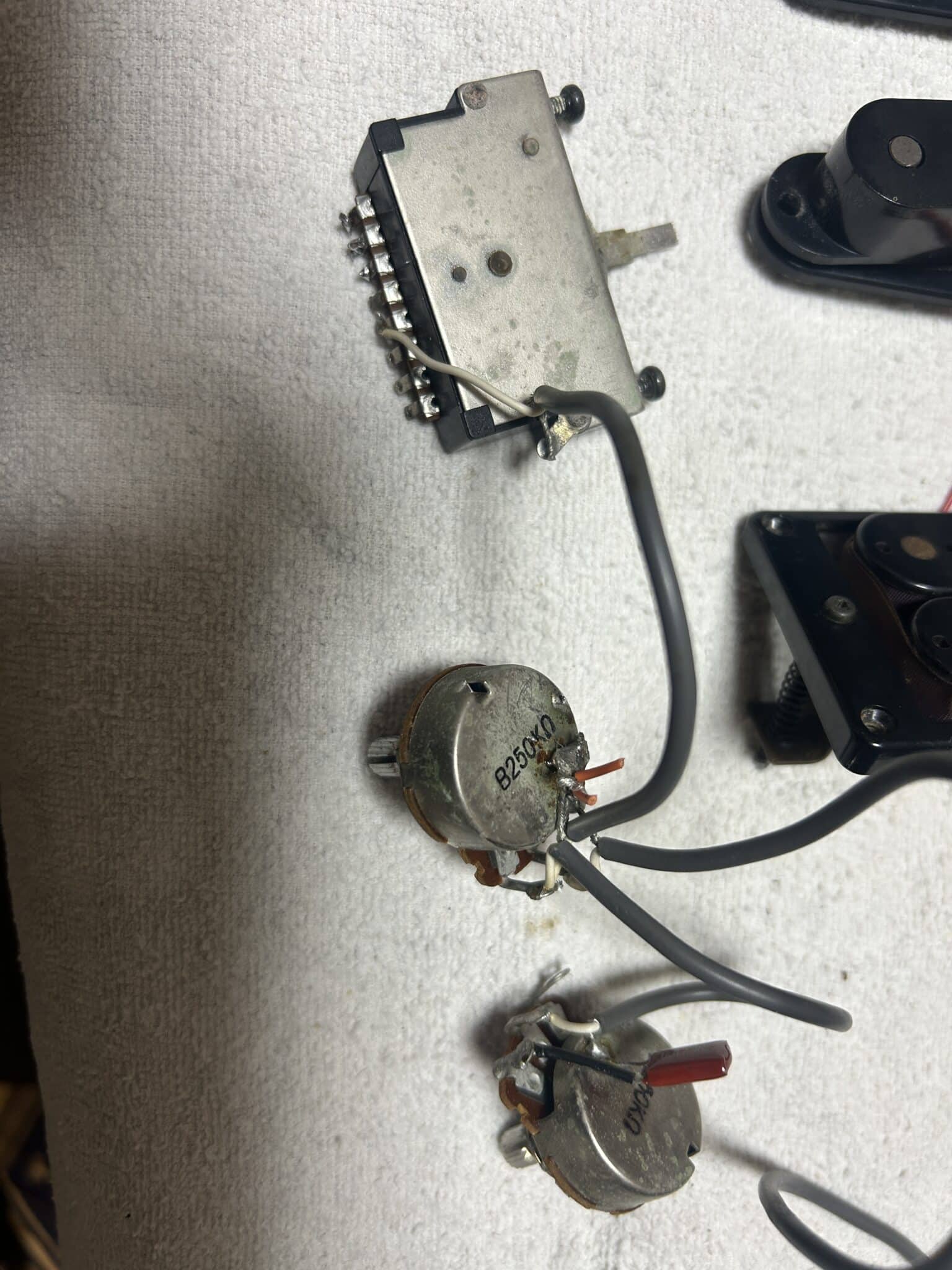 原因はすぐにつかめました。『ピックアップセレクターSW』の不良。経年劣化もあるんですが構造的に変な壊れ方なんですね。だからスイッチ交換するけどちょっとのぞいてみるかな。