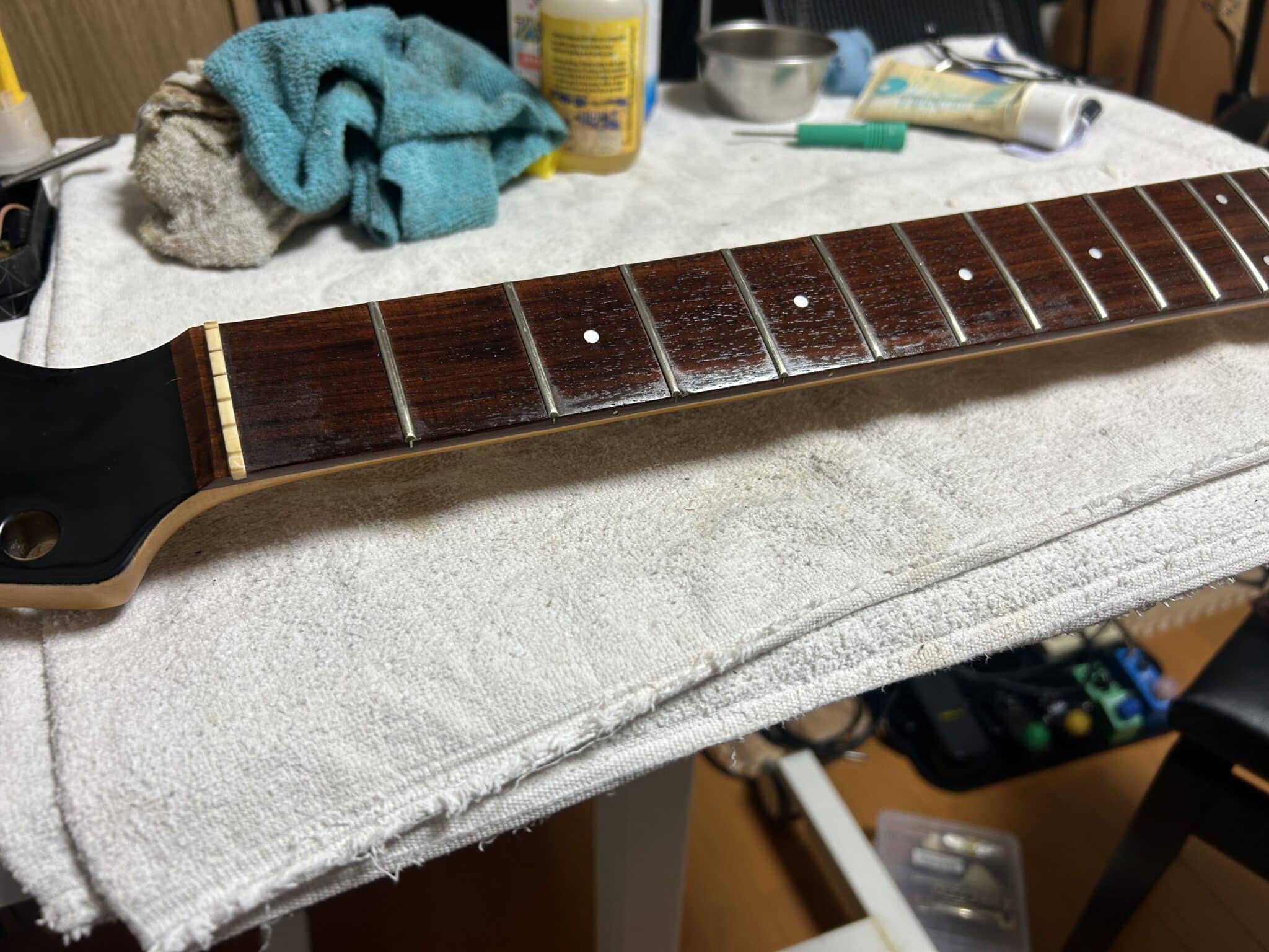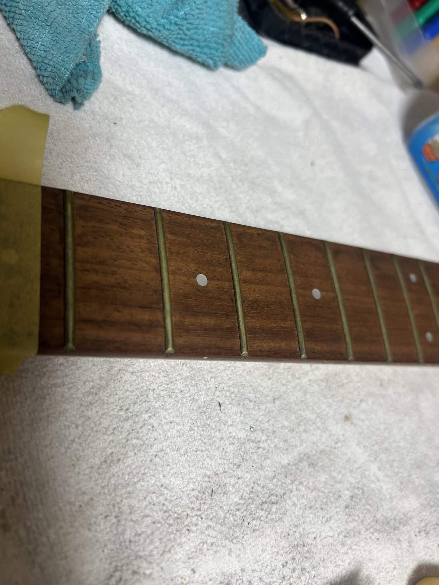 ちょっと作業が前後したが、フレットはいつも通り♯1200のサンドペーパーとコンパウンドでなんとか輝きを取り戻してくれました。