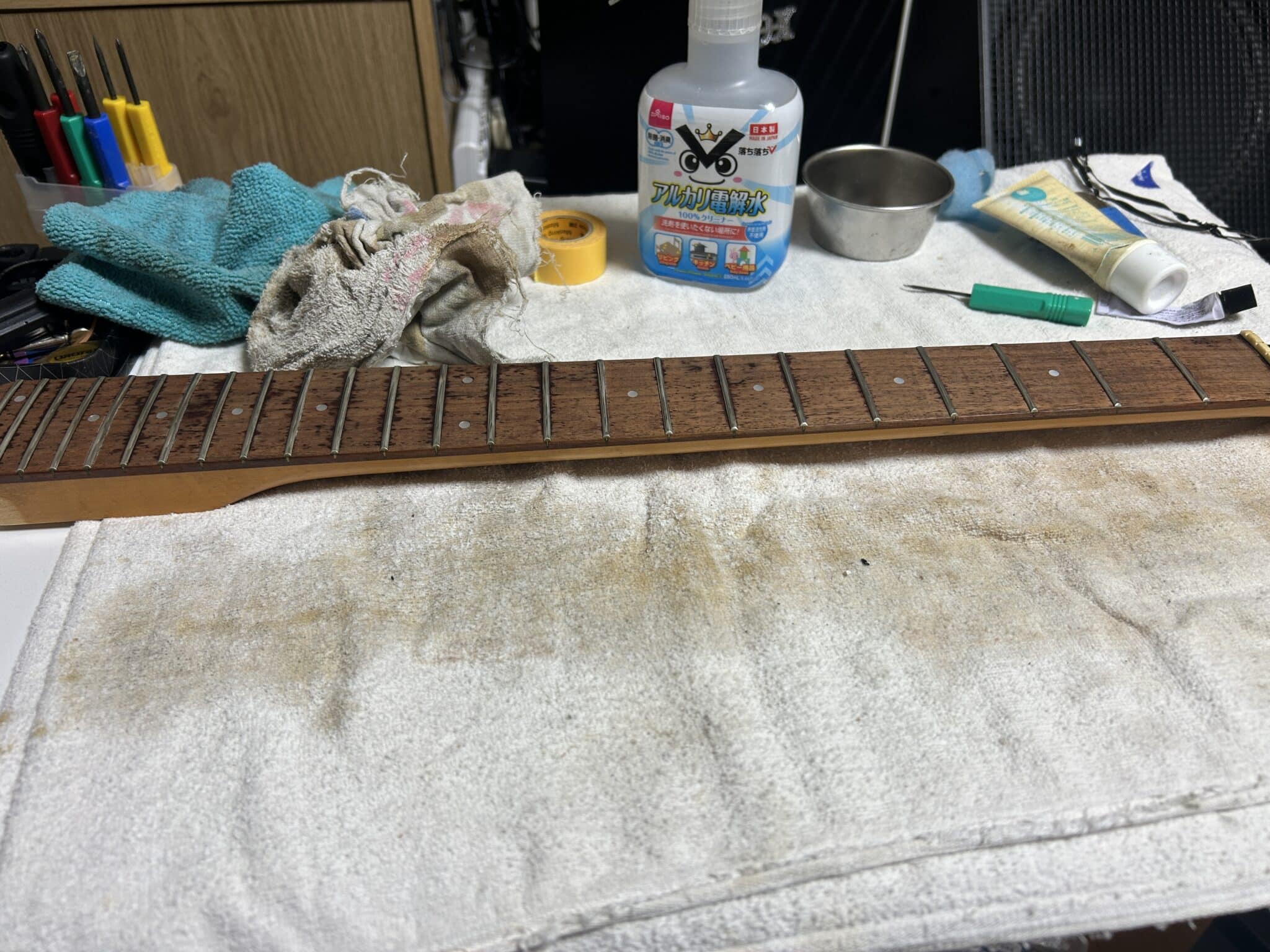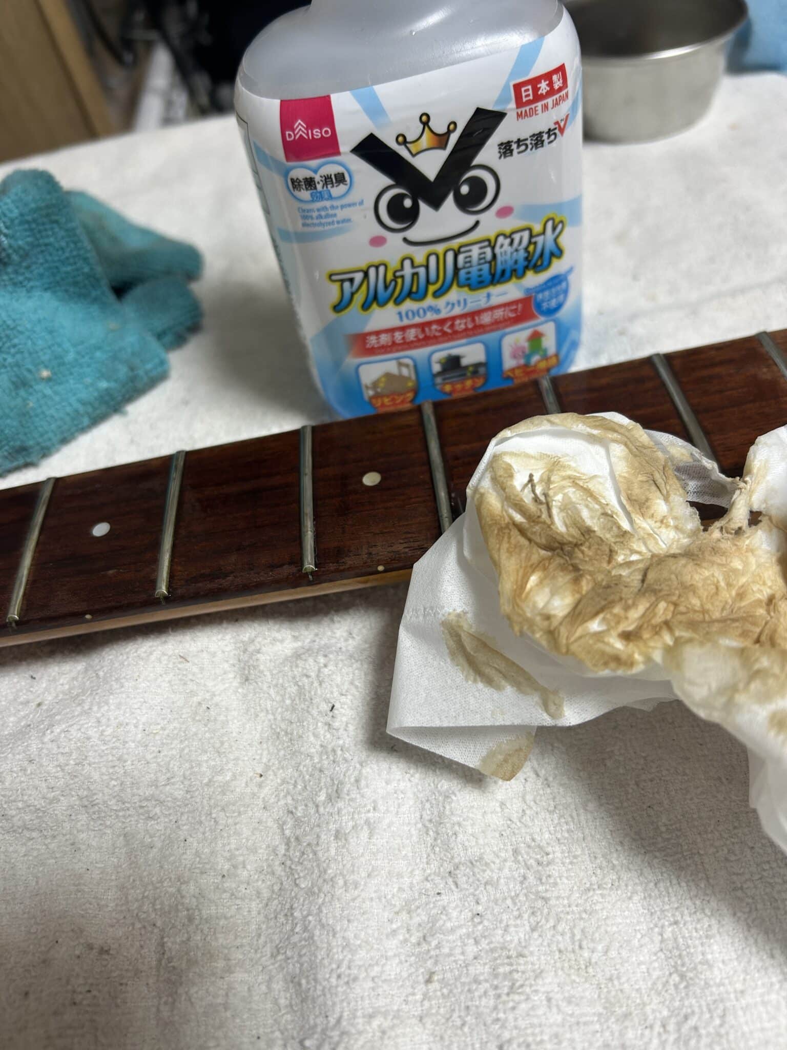 指板なんてこんな。どうやら皮脂汚れなどには非常に有効で、この指板の場合は皮脂+ヤニって感じ。色変わるぐらいよ。