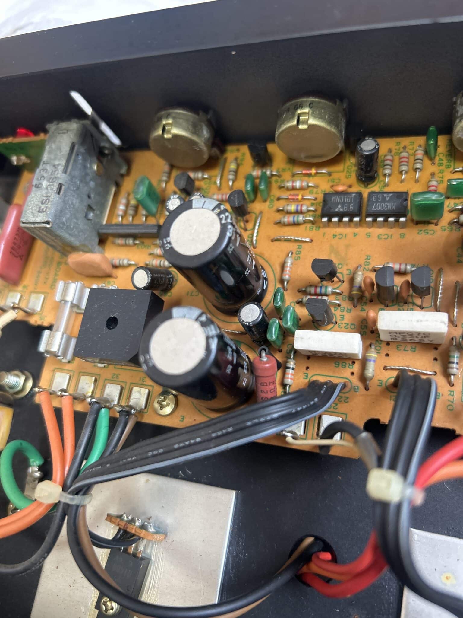 ここね、ボリュームその他のツマミに保護シール貼ってあるんですが剥がされず何年もきかしている様子と外装に傷や打痕などないので、演奏出来るスタイルのお店に何年も据え置きか放置じゃないかな〜。な感じしたんです。電源入るしノイズ出るし。