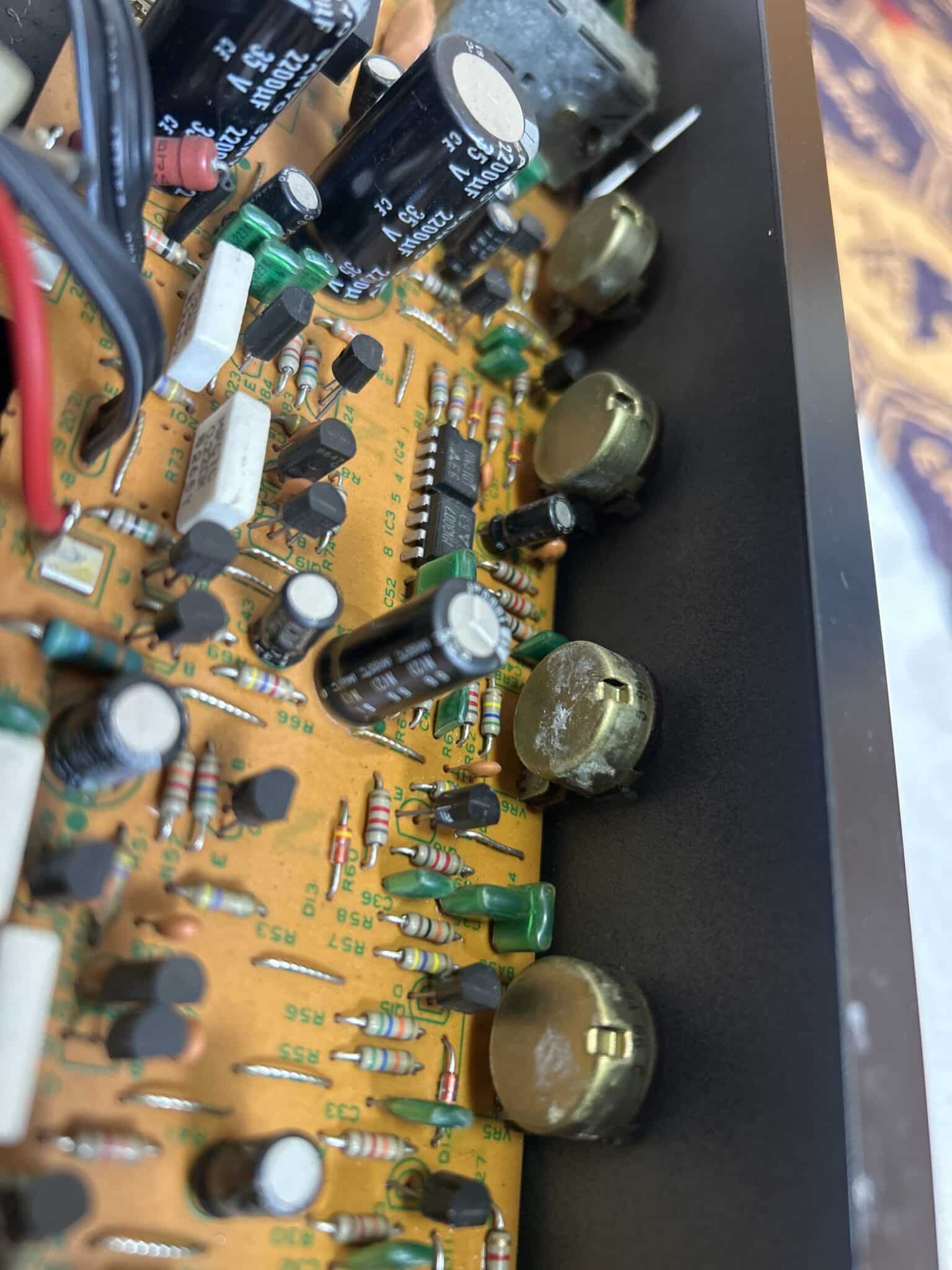 右側に並んでる丸いのね、可変抵抗っていわゆるボリュームとかのダイヤルのやつね。こいつらが経年劣化とか長期放置で接点不良を起こしてるのではないかと推測。軽い場合はケミカルとかで復旧することが多いね。この辺りもバイク整備やってた時の知識ね〜
