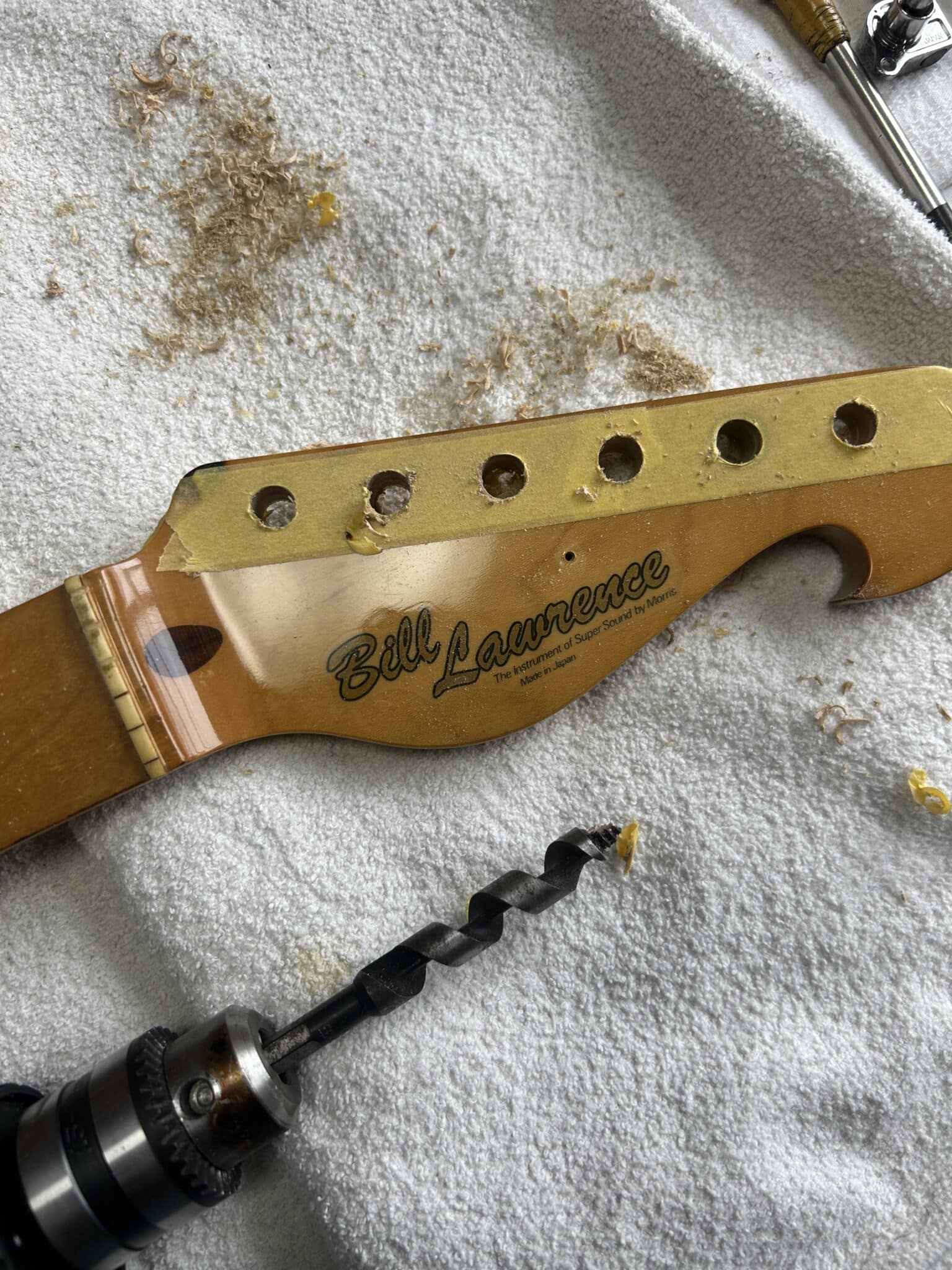 手持ちのペグとサイズ合わせないと使えなかったもんで。本来であればクルーソンタイプって古典的なのが付いてたんですが諸事情でロトマチックタイプってのに交換。で、加工が必要でしたので〜
